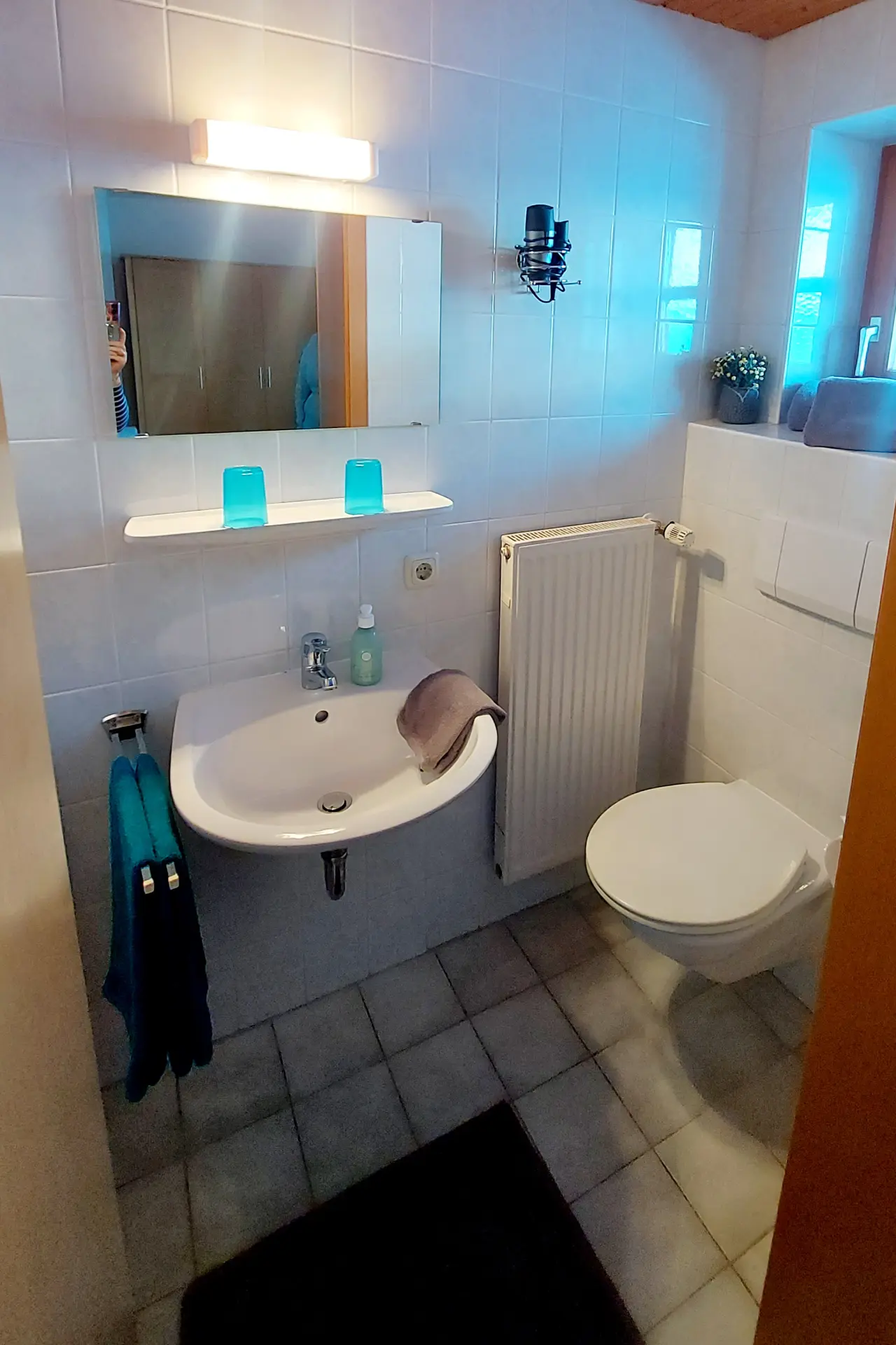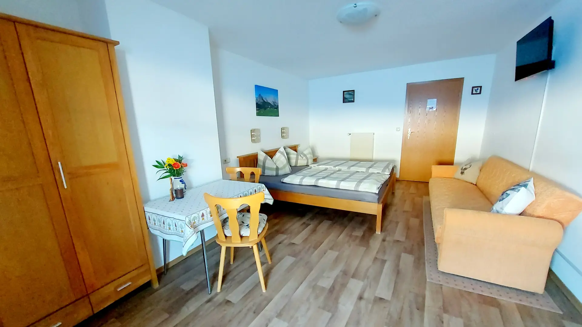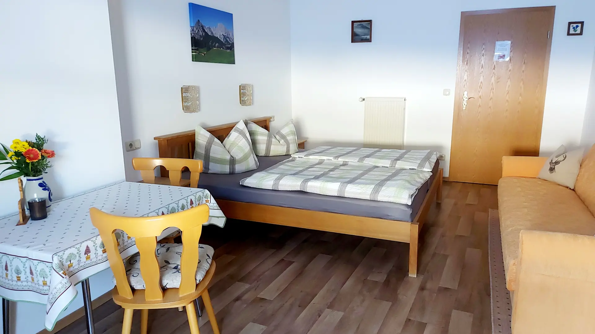 Das Doppelzimmer ist mit Dusche/WC und einem TV ausgestattet. Das Zimmer verfügt über eine Ausziehcouch, somit kann es auch als Dreibettzimmer genutzt werden. Die Einrichtung des Doppelzimmer ist gemütlich und im ländlichen Stil. Die Aussicht können Sie vom Balkon aus genießen. Das Zimmer liegt im ersten OG. Als weiteres Extra gilt die Gästeküche, der Gästekühlschrank wie auch der Aufenthaltsraum. Für Sie als individualreisenden bieten wir einen kostenfreien Stellplatz für ihr Auto an. Wir freuen uns auf Sie als Gast.