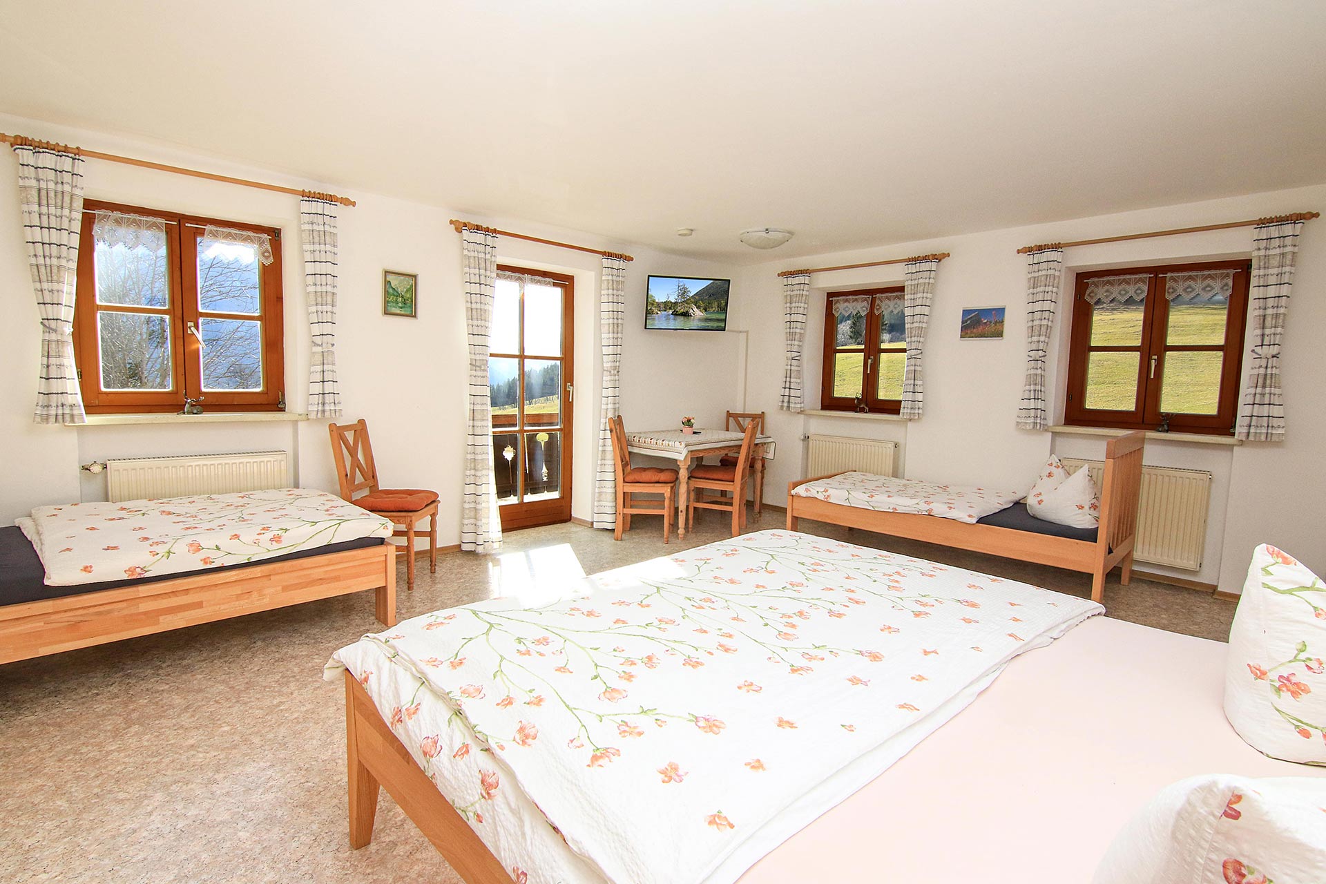 Das Vierbettzimmer ist mit Dusche/WC und einem TV ausgestattet. Die Einrichtung des Vierbettzimmers ist gemütlich und im ländlichen Stil. Die Aussicht können Sie vom Balkon aus genießen. Der freie Blick auf die Berge wird Sie begeistern. Das Zimmer liegt im ersten OG. Als weiteres Extra gilt die Gästeküche, der Gästekühlschrank wie auch der Aufenthaltsraum. Für Sie als individualreisenden bieten wir einen kostenfreien Stellplatz für ihr Auto an. Wir freuen uns auf Sie als Gast.